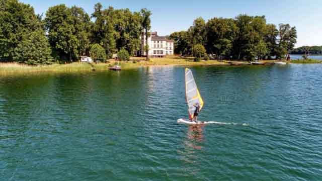 Neorenesansowy pałac wzniesiony został w ostatniej ćwierci XIX wieku. Jego obecna forma jest wynikiem licznych przebudów, dokonanych w latach 1889, 1910 i 1923 oraz powojennych już remontów i adaptacji. Budowla za sprawą wież prostokątnych oraz sześciobocznej, zakończonych krenelażem i innych zdobień stylizowana na zamek. Fasada wzbogacona została wysuniętym przed lico, kolumnowym, arkadowym gankiem w kształcie łuku Tudorów, nad którym utworzono taras. Elewacja ogrodowa skierowana w stronę jeziora poprzedzona została szerokim tarasem o identycznej jak skrzydła głębokości. Jedynymi zachowanymi elementami wy­stroju są zdobienia na sklepieniach kolumnowego holu i na sufitach korytarzy oraz sto­larka okienna i drzwiowa z maswerkowymi nadświetlami. W dużej, reprezentacyjnej sali, zlokalizowanej w południowo-wschodnim narożniku korpusu, zachowało się obramienie kominka. Nad prowadzącymi do niej drzwiami, na elewacji ogrodowej przetrwał kartusz z herbem rodu Castell w formie biało-czerwonej szachownicy.