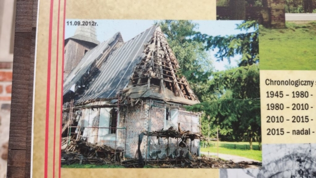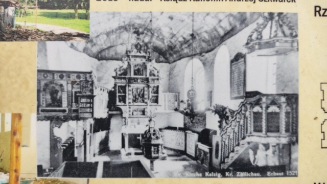 Na zdjęciach na tablicy informacyjnej widzimy, że przed 1945 rokiem wyposażenie wnętrza było bogate: wspomniany ołtarz, okazała chrzcielnica z 1722, ośmiokątny baldachim i wreszcie bogato polichromowane sklepieni beczkowe. Dziś nic z tego wyposażenia nie zobaczymy. Po II wojnie światowej remont kapitalny zakończył się w roku 1959.