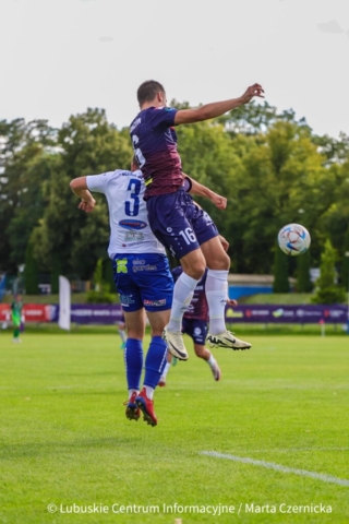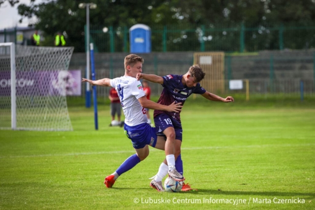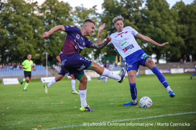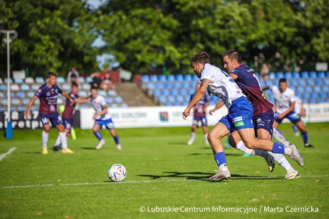 Warta Gorzów wiceliderem III ligi! A miała spaść… (ZDJĘCIA) Dwaj mężczyźni walczą o piłkę